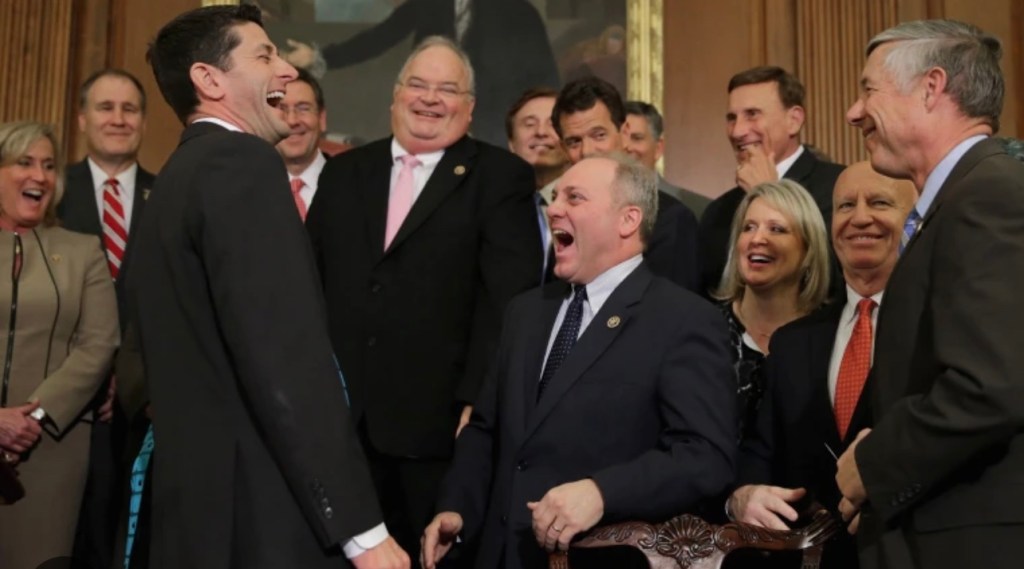 When that journalist asked the taboo question. McCarthy zeroed in on the offender, sending a laser beam jolt via eye contact. A hush fell over the crowd. Then like Jack Nicholson in “One Flew Over the Cuckoo’s Nest”, McCarthy burst into guttural laughter, and the Greek chorus behind him joined in. Hahaha. [They recall all the years they schemed and fought to gift the wealthy an insurmountable wealth gap] hahaha… [the photo of their celebration with Tim Ryan when that rate cut that gave an 8% tax bracket, and allowing special deductions like private jets and yachts, flashes into my mind]… hahaha. Then, like an orchestra after a tic of the conductor’s baton, silence resumed. McCarthy said, “NO. We will not raise taxes.” He turned his back on the reporter, (now a zombie).