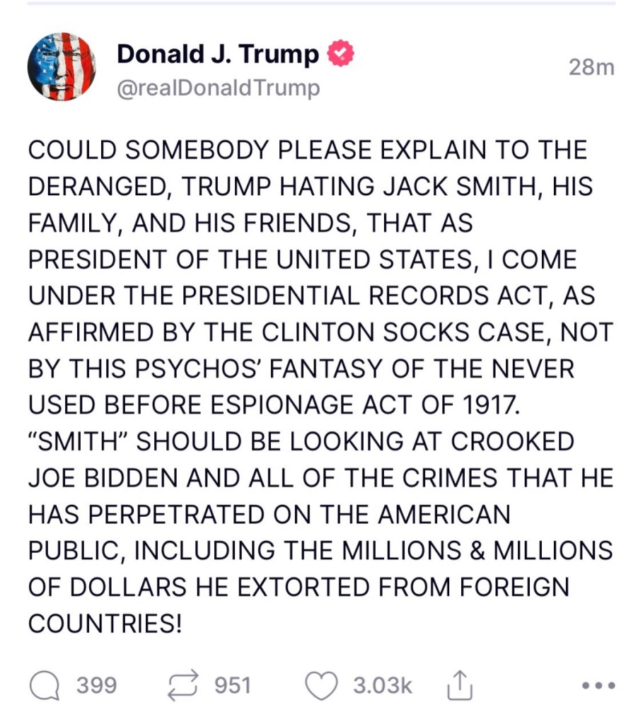 Daily leaks of damning audio tapes—Trump brings classified documents to show and tell. He is a stupid, evil man. The leaks are coming from him. They may be an attempt to desensitize us to his crimes and reduce the shock value before he faces a jury. Whatever his plan, he will not outsmart Jack Smith.