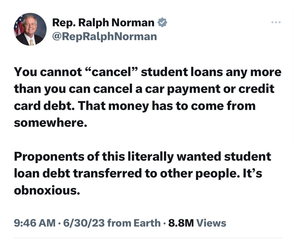 Rightwing billionaire, Harlan Crow, paid $150,000 in tuition for Clarence Thomas’ nephew to attend boarding school, yet college debt relief for students unrelated to him is not okay.