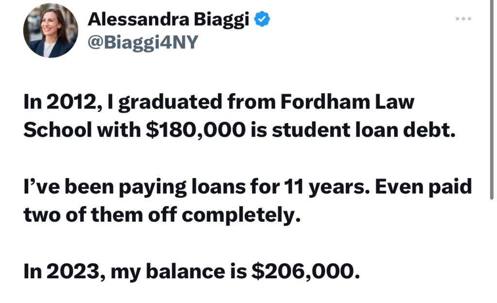 Hypothetical: A person graduates with a bachelor’s degree, and gets lucky, starting a job less than six months after they received their diploma via zoom. Their $400 student loan payments commence, and despite a decent salary, enough to rent an apartment with roommates, there is no discretionary income. No money left to save for retirement, as a down payment for a home or to start a family. That capital feeds the perpetually subsidized banking system, whose CEOs gorge on bonuses. It is not going back into the economy.