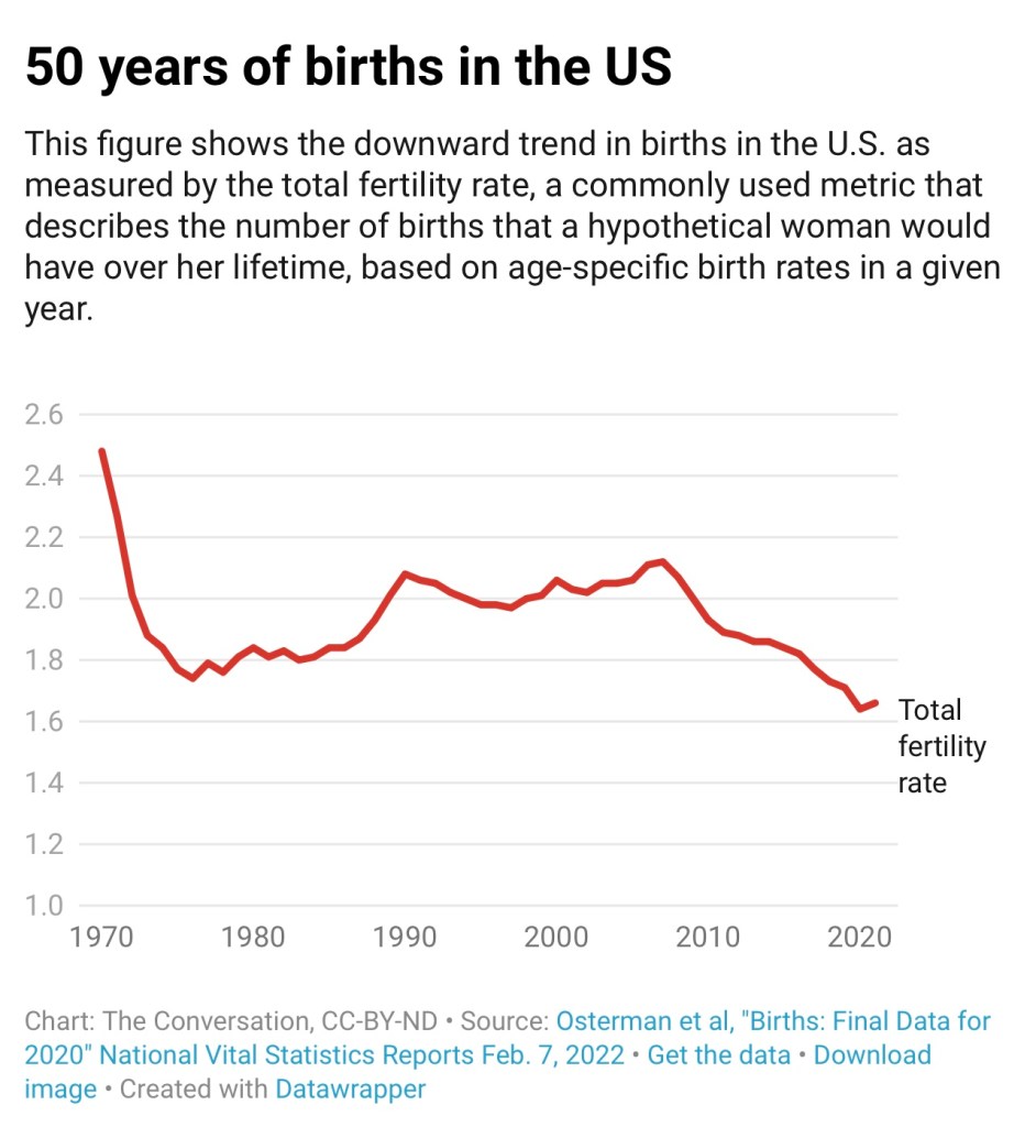 With issues like student debt, the climate crisis, and daily mass shootings, it’s understandable that young people may question their prospects for the future. It’s not surprising that the birth rate in the U.S. has steadily decreased over the past fifteen years. The decline in population could be behind the anti-abortion and forced birth laws in the country. Republicans have stated birth control will be targeted next.