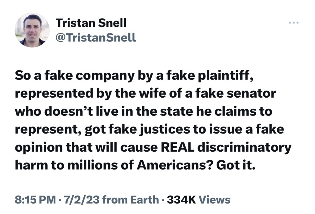 This Supreme Court ruled in favor of a fake business on a fake premise using the name of a man who was not involved. A catholic woman whom has not even started a business sued for the right to discriminate on her (nonexistent) website, to refuse service based on sexuality.
