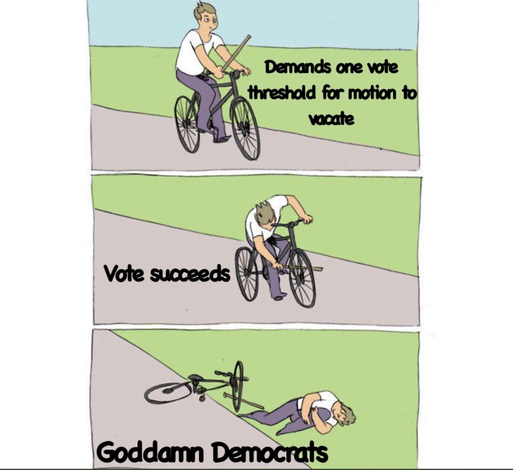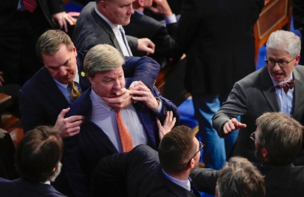 We do have an “Acting Speaker” The first order of business by the new acting speaker, Patrick McHenry, the little guy with a bow tie who makes the gavel look like Thor’s hammer, was to slam the gavel as hard as he could.