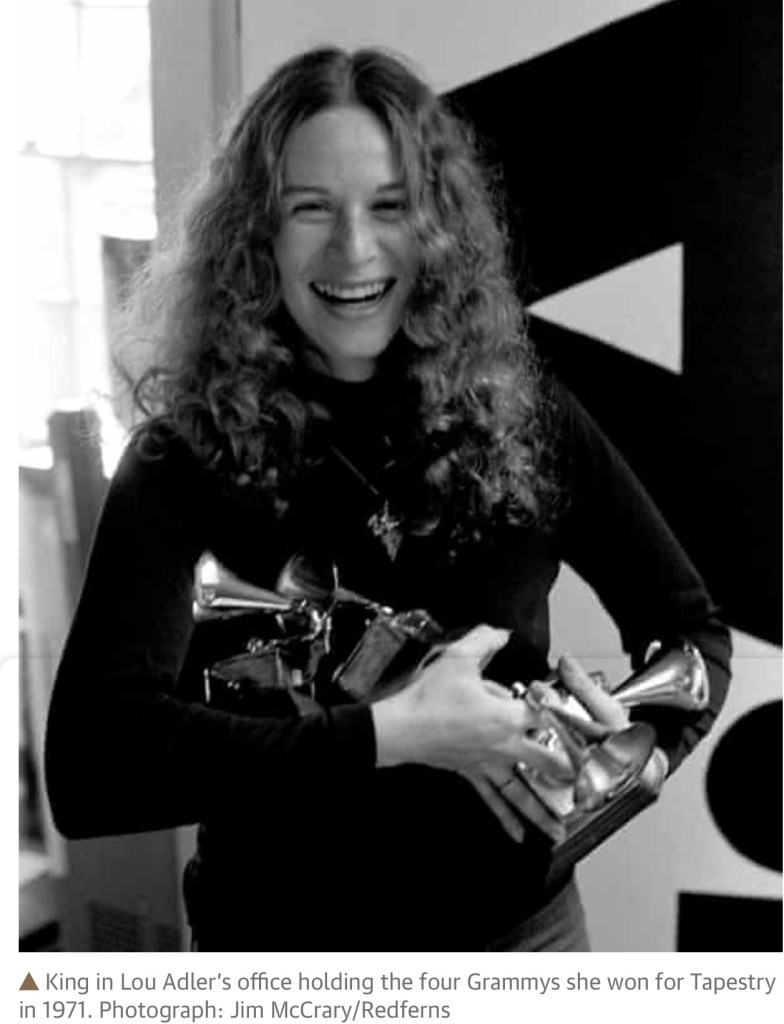 Imagine applying this practice to the great painters: “And the award for best self-portrait by an artist with one ear goes to…” It’s stupid. The statue of David has been quite successful without the preface of “award-winning marble carving.” Art is what it is, personal, and the measure of its worth is in the response evokes from viewers or listeners. (If only I were in charge.) For that reason, a list of Carole King’s achievements is meaningless.