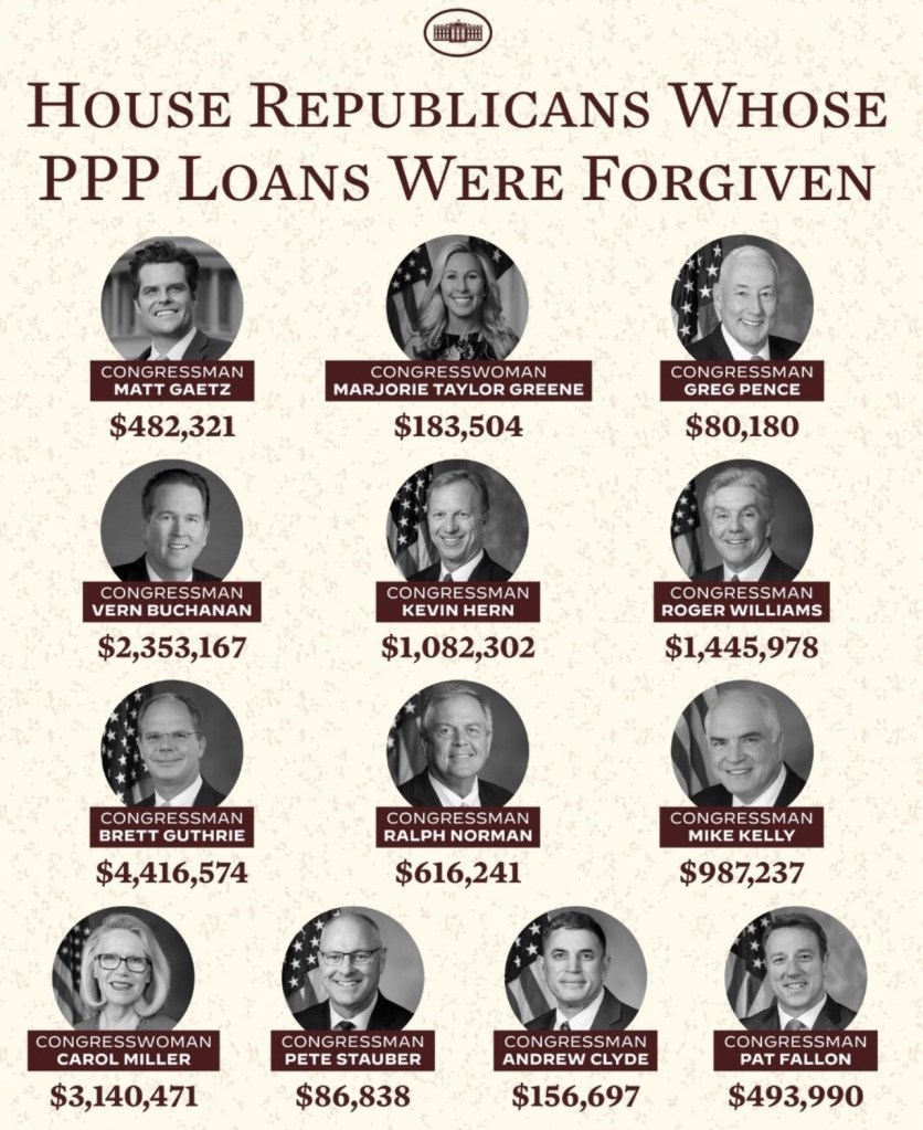 In 2023, Oklahoma’s U.S. Representative Kevin Hern had assets worth between $36 million and $110 million. He still took $1,082,302 in a PPP forgiven loan. I think he can afford to pay it back to “hardworking taxpayers of America.”