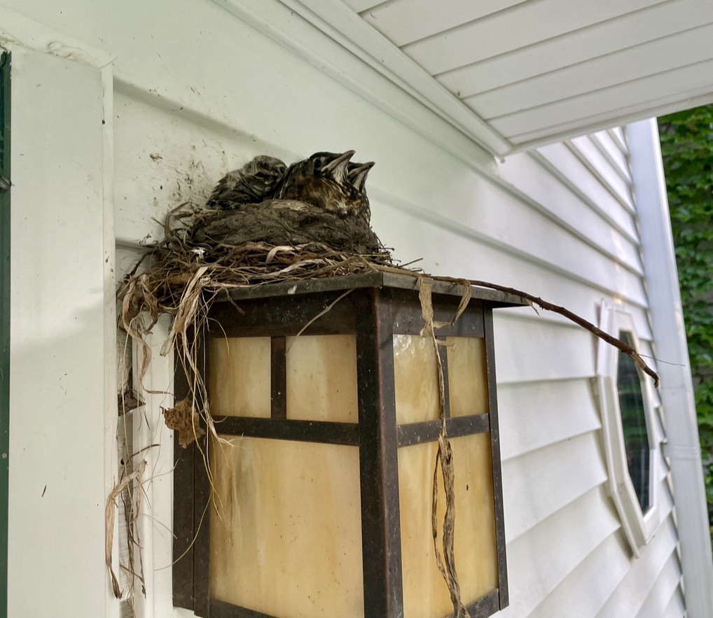 I didn’t know any of that after the first group flew the coop, so I cleaned the area and tossed the nest. They were thankful and began reconstruction on that same light fixture after the second group hatched. Had I left the old nest where it was, they would have rebuilt somewhere else. They don’t recycle.