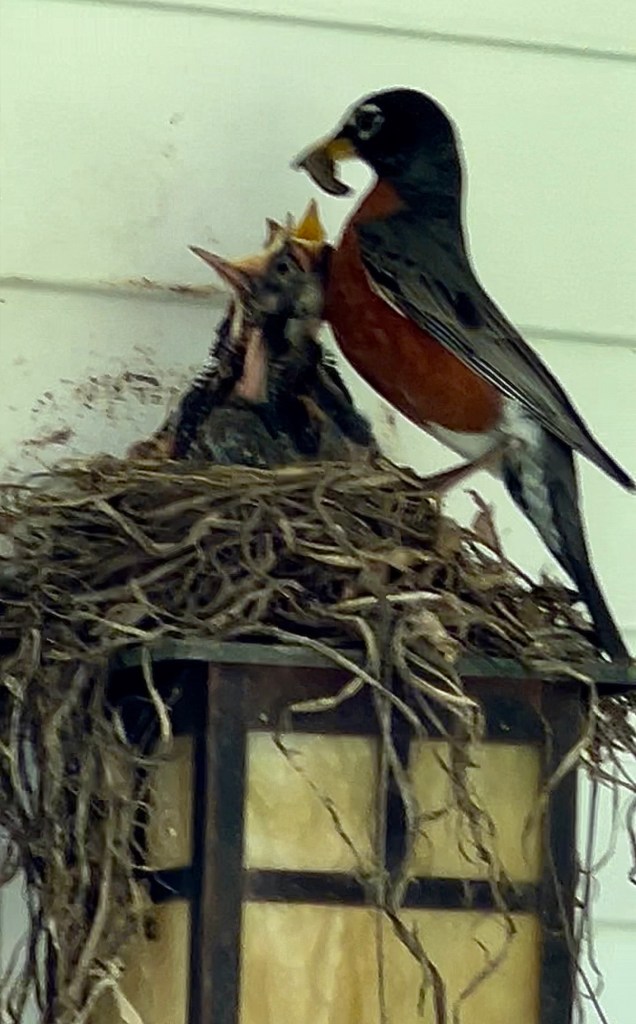 I want to share this photo, the third nest, in as many months, built on the porch light next to my front door. My daughter captured the image as she entered, two days ago, before two giant robins attacked her. She is fine. Her hair was fluffed.