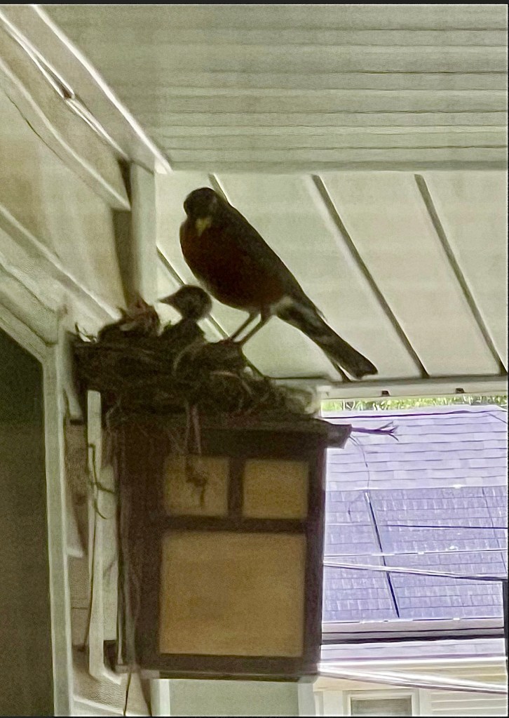 From this window, I had a clear view of nest #2. I watched the two-week stage: building the nest to sitting on eggs. Then the fun part, two weeks from hatchling to departure. I worried when only one remained, afraid to take the leap. By morning, they had all flown the coop. I remember when mine left. [😢😭]