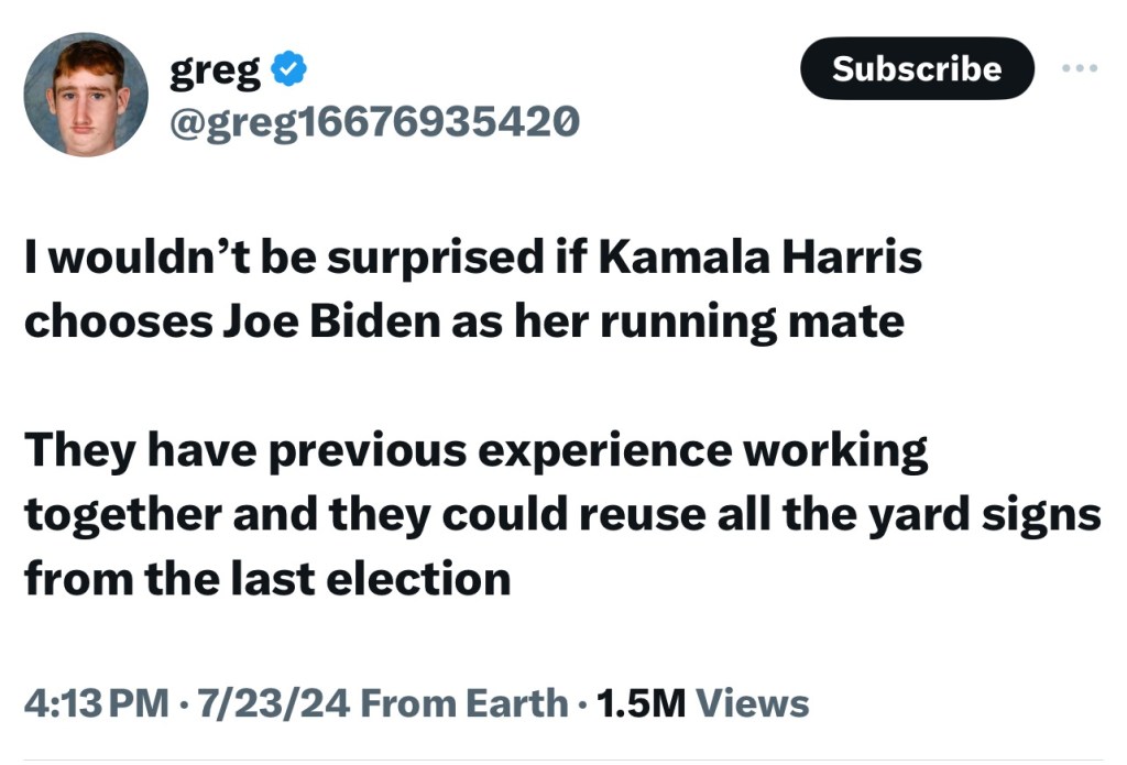 1. Did you see the two Kamala ads online? One is about choosing Freedom, the other is “I’m Kamala Harris and I approve this message.” So darn good. Both of them.