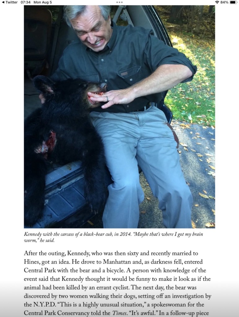 A completely sober RFK Jr. suggested to his drunken friends that they head to Central Park and stage a bike / bear accident. He happened to have a bike in his van. Someone had given it to him to get rid of. 🤔 How perfectly the stars aligned to complete the task.
