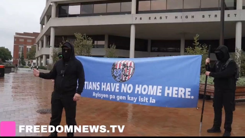 Meanwhile, in Ohio, a small group of antagonists, who came from elsewhere, claiming to be Antifa, garbed in black, with faces hidden by what looks like black support hose, under sunglasses, chanted “Haitians have no home here.”