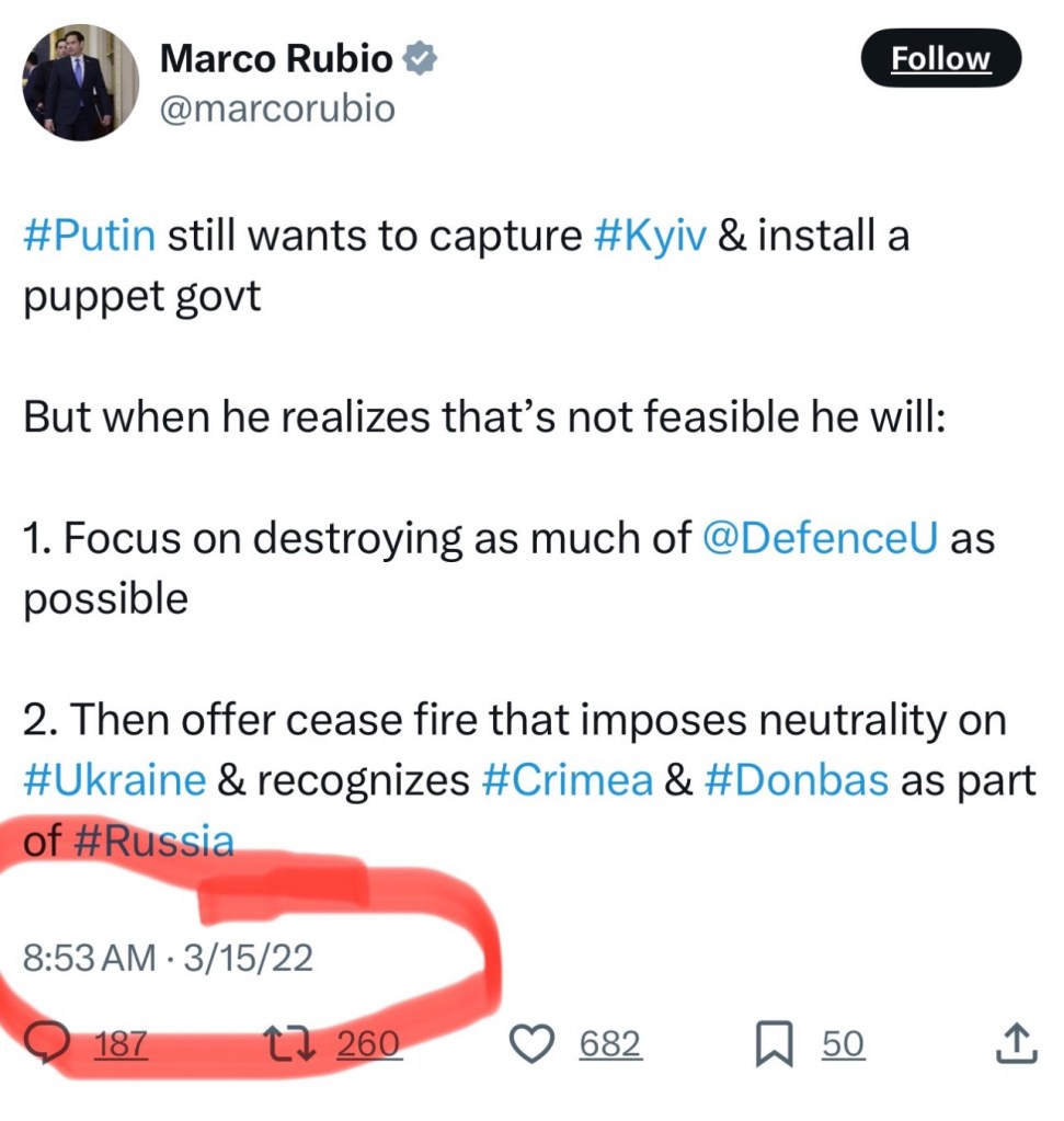 According to Trump’s Secretary of State, Marco Rubio, Russia is a country we must align with: “take advantage of the incredible opportunity” to work with Putin geopolitically, economically, and on issues of common interest.