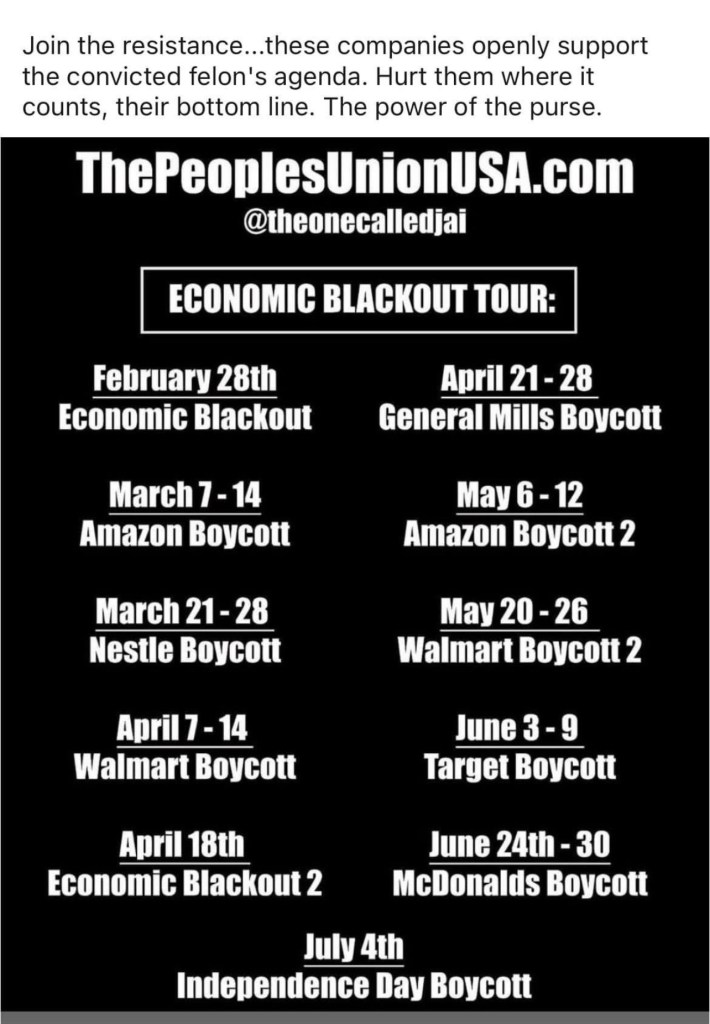 The first economic protest is this Friday, February 28. To participate, buy nothing from Amazon, General Mills, Nestlé, Walmart, Target, McDonald’s.