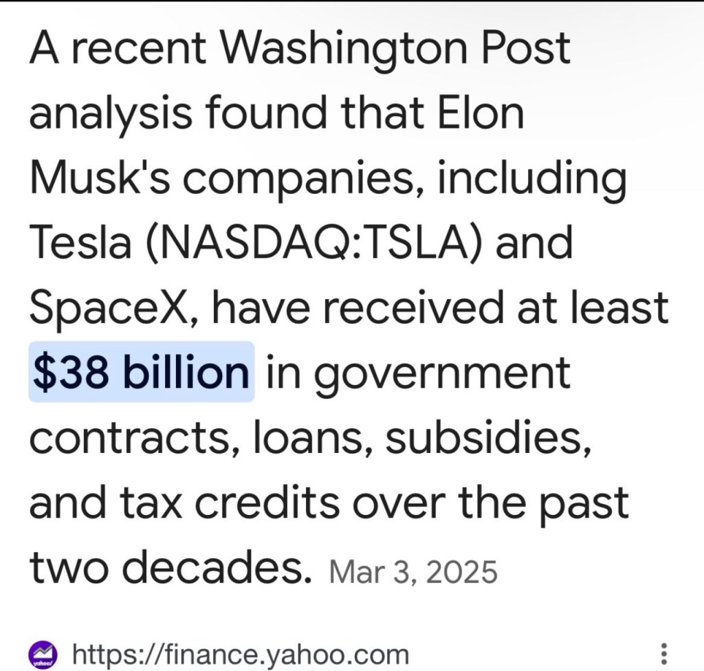 Musk has said he will save “half a trillion dollars” lost through waste, fraud, and abuse. That is a random number he spit out to try to sway an audience during an interview. In fact, taxpayers provide the richest guy on the planet, Elon Musk, subsidies for Tesla and SpaceX, totaling $8 million DAILY. That is waste, fraud, and abuse. He is conspiring to take Social Security. This South African man who entered the country on a student visa, never attended school, and never left, hired college aged nerds to hack into the national treasury. Why is he involved in our government?