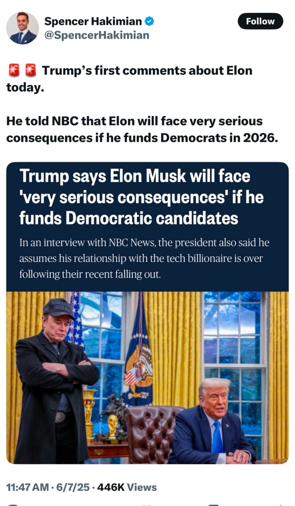 “Elon wants to stick to the principles of not giving the Democrats stupid ideas, money, and stuff.” ~ Errol Musk