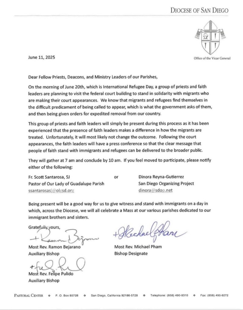 In response, Pope Leo XIV, has appointed his first U.S. bishop, a refugee from Vietnam. He is mobilizing clergy to accompany migrants at immigration court on June 20.