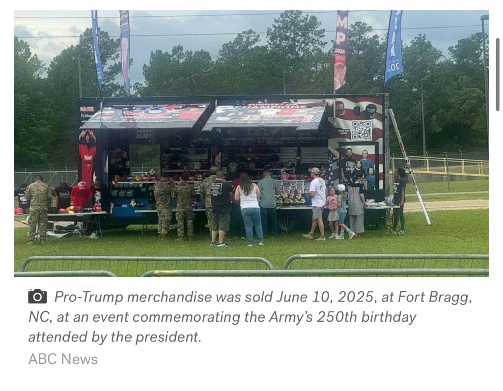 As usual, Trump turned a military ceremony into a cash grab. Vendors popped up just off the staging area, hawking Trump-branded merchandise—“Make America Great Again” hats and “America First” (made in China) paraphernalia. An investigation is now underway about whether the sales violated long-standing Defense Department policy, which prohibits active-duty troops from wearing political apparel or displaying partisan symbols while in uniform.