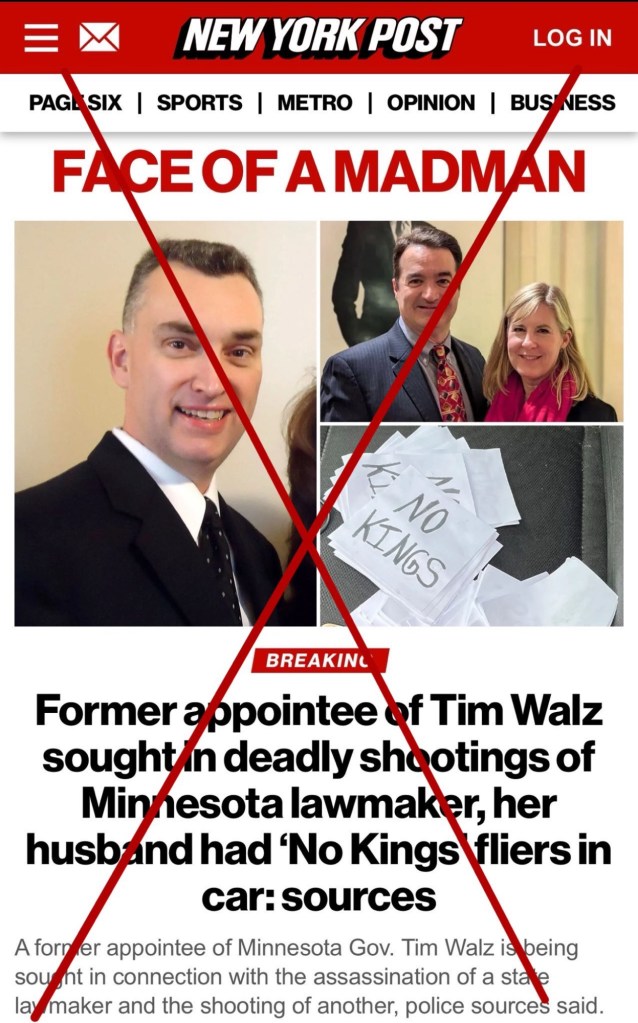 With all of yesterday’s excitement; rallies, marches, and Trump’s thing, you may have missed the news of political assassinations out of Minnesota. The New York Post (a Rupert Murdoch publication) immediately published a misleading story, but here are the facts. Vance Luther Bolet, a White Christian Nationalist, Republican, Trump supporter, and self-proclaimed “pro-life” extremist with a hit list, posed as law enforcement, broke into two homes, and started checking names off.
