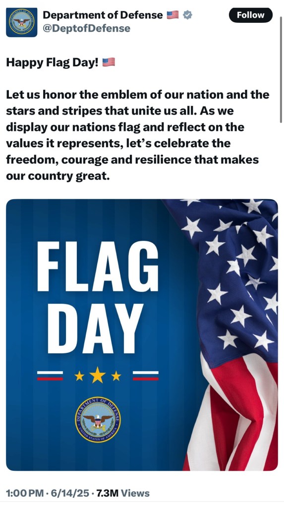 The DOD has posted a Flag Day image with two Russian flags, abutting the gold stars. Pete ‘it’s apple juice’ Hegseth must’ve thought no one would notice. Was this a tipsy texting type of mistake, or the latest move to ease us into Mother Russia’s warm embrace? I’d say the latter. Perhaps he’s vying for a job with RT? (Russian Television)