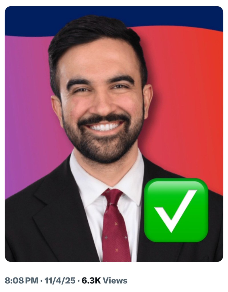 - New York: winner, winner, chicken dinner. Zohran Mamdani, is [scary music plays] a Muslim. Be afraid! He has threatened to tax the rich, freeze rents, and provide bus transportation for free. The Republican party’s unified scare messaging that he is a “Marxist, socialist, communist.”
