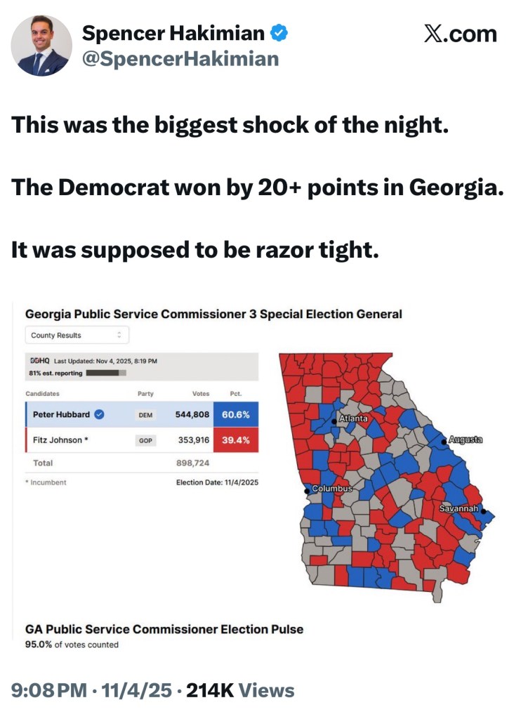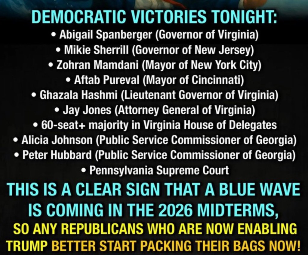 It is my opinion that today is Friday. I can’t confirm that because, as a Democrat, my understanding of events is regularly questioned. I can affirm that it has been three days since my party swept the 2025 election, which should have sounded alarms for the losers about their vulnerability to voter backlash.