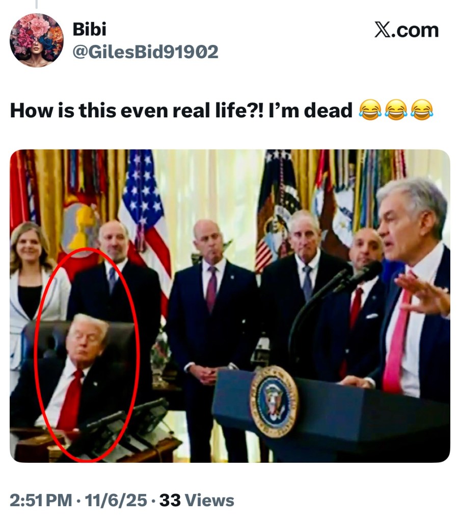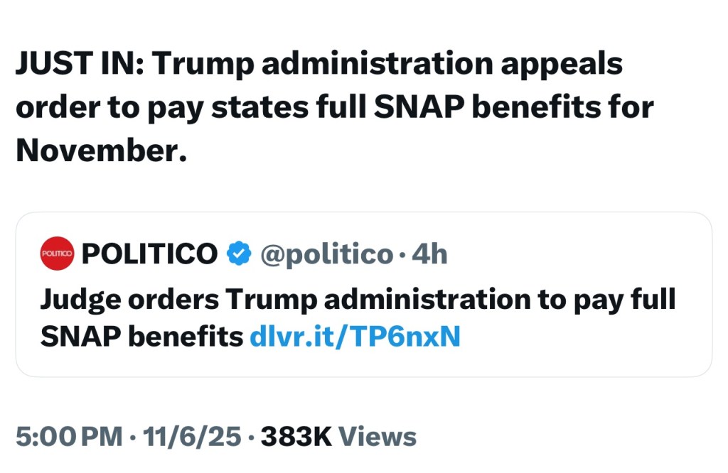 How in the heck do you appeal an order to feed the American people??!! JD set me straight: “We’re not going to listen to a federal judge.” Well, shut my mouth, JD. I think what you meant to say is, “We’re not going to listen to any judge.” How many people on SNAP voted for Trump? Let’s see a show of hands right now! Yeah, I guess that poor man with the medical emergency really cut into Trump’s prime time. Better have less people in the office next time…