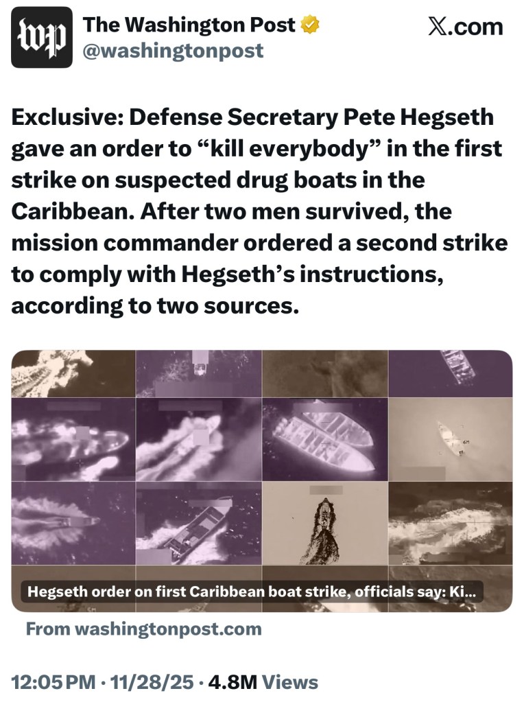 DUI hire, drunk on power and alcohol, Pete Hegseth ordered Seal Team 6 to “kill everybody.” Trump’s secretary of war has killed over 80 people, bombing Venezuelan fishing boats, claiming (but cannot confirm) they were transporting drugs. He is perpetrating war crimes in a time of peace, and his conduct raises serious human-rights concerns.