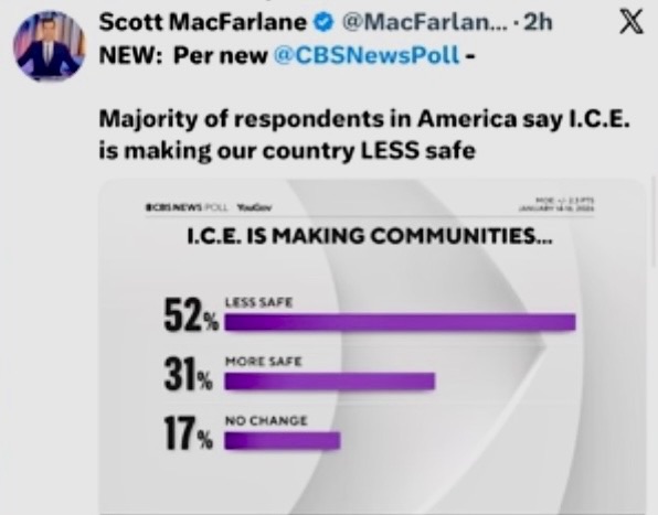 ICE consists of various vulgus (it’s a word) miscreants, including pardoned 1/6 felons, who hide their faces to avoid being matched with their mugshots. They escalate situations to the point of releasing toxic chemicals (banned in international law) or, as we saw last week, shooting people in the face. Trump
